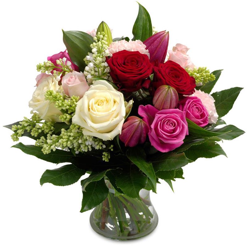 Klasyczny bukiet z delikatną mieszanką różowych, białych i czerwonych róż, goździków, lilii z mniejszymi kwiatami dekoracyjnymi i bujną zielenią. Ten ponadczasowy bukiet emanuje urokiem i pięknem vintage, wywołując uczucie nostalgii i romantyzmu. Ręcznie ułożony i dostarczony nawet tego samego dnia, ale w świetnej cenie.