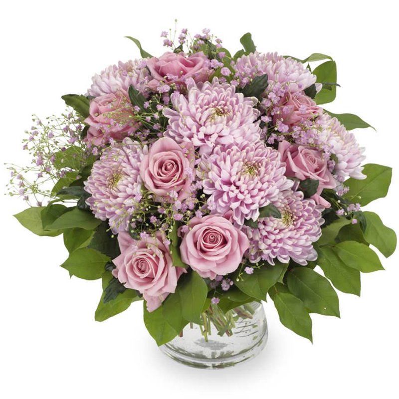 Kompozycja składająca się z różowych róż, chryzantem i gipsówki. Wszystkie kwiaty w bukiecie są koloru różowego.  Dekorację bukietu stanowią ułożone na okrągło liście. Do bukietu skomponowanego przez lokalną kwiaciarnię Euroflorist można dołożyć bilecik z życzeniami.